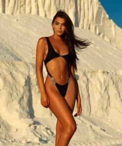 Steal all the stares at the poolside with this swimsuit. Featuring a black bandage material with lemonlunar diamante silver details, an extreme slashed cut-out design, we’re obsessed.